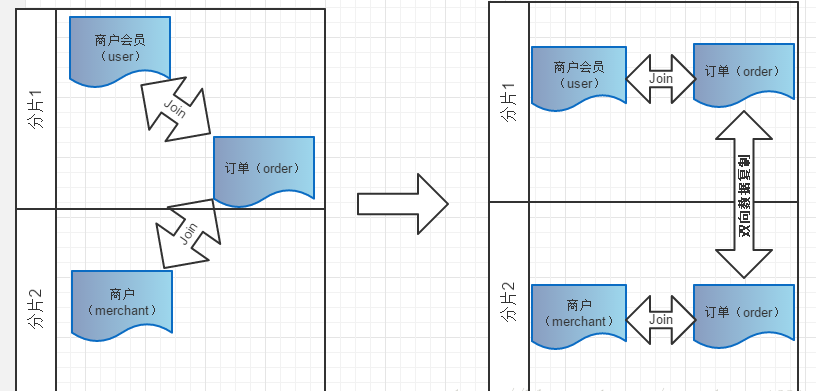 有一类业务场景是 “主表A+关系表+主表B”,举例来说就是商户会员+订单+商户,对应这类业务,如何切分? 从会员的角度,如果需要查询会员购买的订单,那按照会员进行切分即可,但是如果要查询商户当天售出的订单,那又需要按照商户做切分,可是如果既要按照会员又要按照商户切分,几乎是无法实现,这类业务如何选择切分规则非常难。目前还暂时无法很好支持这种模式下的3个表之间的关联。目前总的原则是需要从业务角度来看,关系表更偏向哪个表,即“A的关系”还是“B的关系”,来决定关系表跟从那个方向存储,未来Mycat版本中将考虑将中间表进行双向复制,以实现从A-关系表 以及B-关系表的双向关联查询如下图所示: